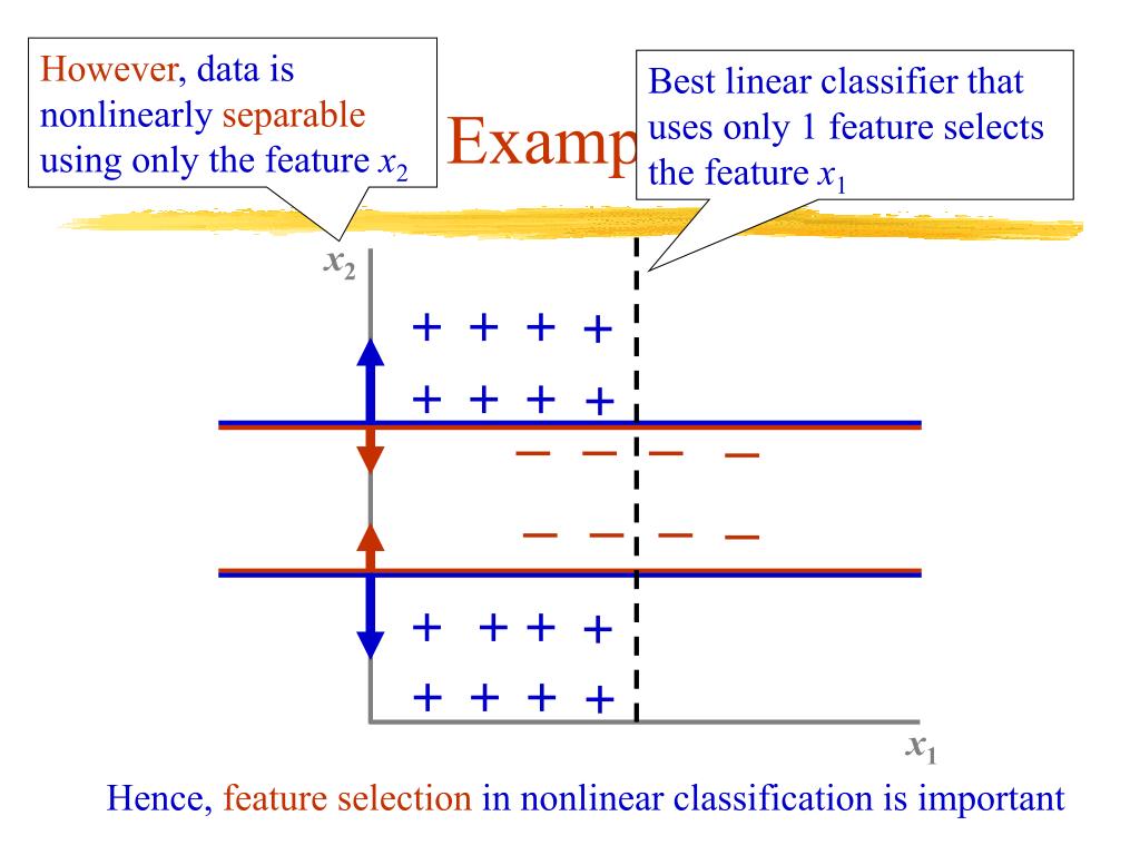 However, data is nonlinearly separable using only the feature x2 Best linear classifier that uses only 1 feature selects the feature x1 Example x2 + + + + + + + + _ _ _ _ _ _ _ _ + + + + + + + + x1 Hence, feature selection in nonlinear classification is important