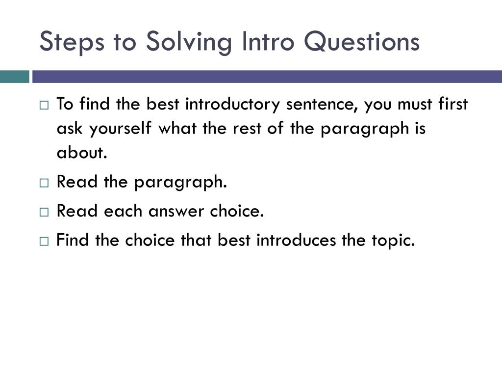 Steps to Solving Intro Questions • To find the best introductory sentence, you must first ask yourself what the rest of the paragraph is about. • Read the paragraph. • Read each answer choice. • Find the choice that best introduces the topic.