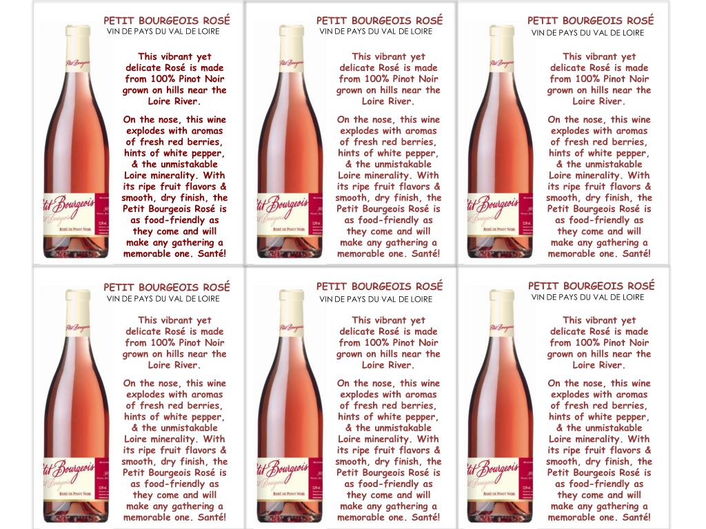 PETIT BOURGEOIS ROS É. PETIT BOURGEOIS ROS É. PETIT BOURGEOIS ROS É. VIN DE PAYS DU VAL DE LOIRE. VIN DE PAYS DU VAL DE LOIRE. VIN DE PAYS DU VAL DE LOIRE. This vibrant yet delicate Rosé is made from 100% Pinot Noir grown on hills near the Loire River.