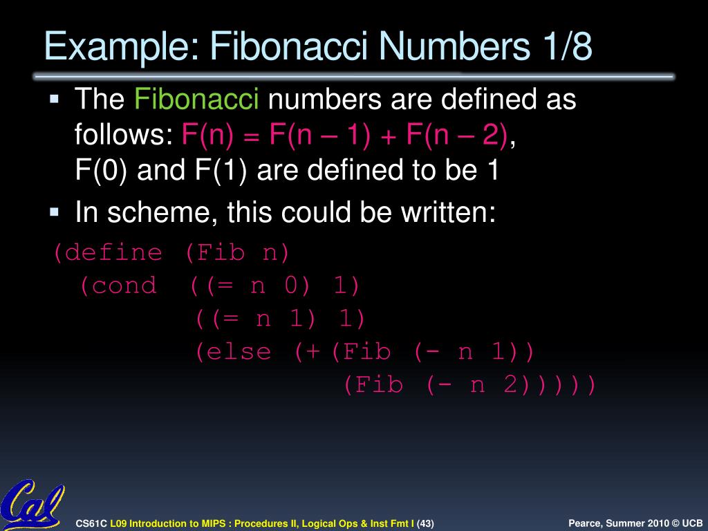 Example: Fibonacci Numbers 2/8 • Rewriting this in C we have: intfib(intn) { if(n == 0) { return 1; } if(n == 1) { return 1; } return (fib(n - 1) + fib(n - 2)); }