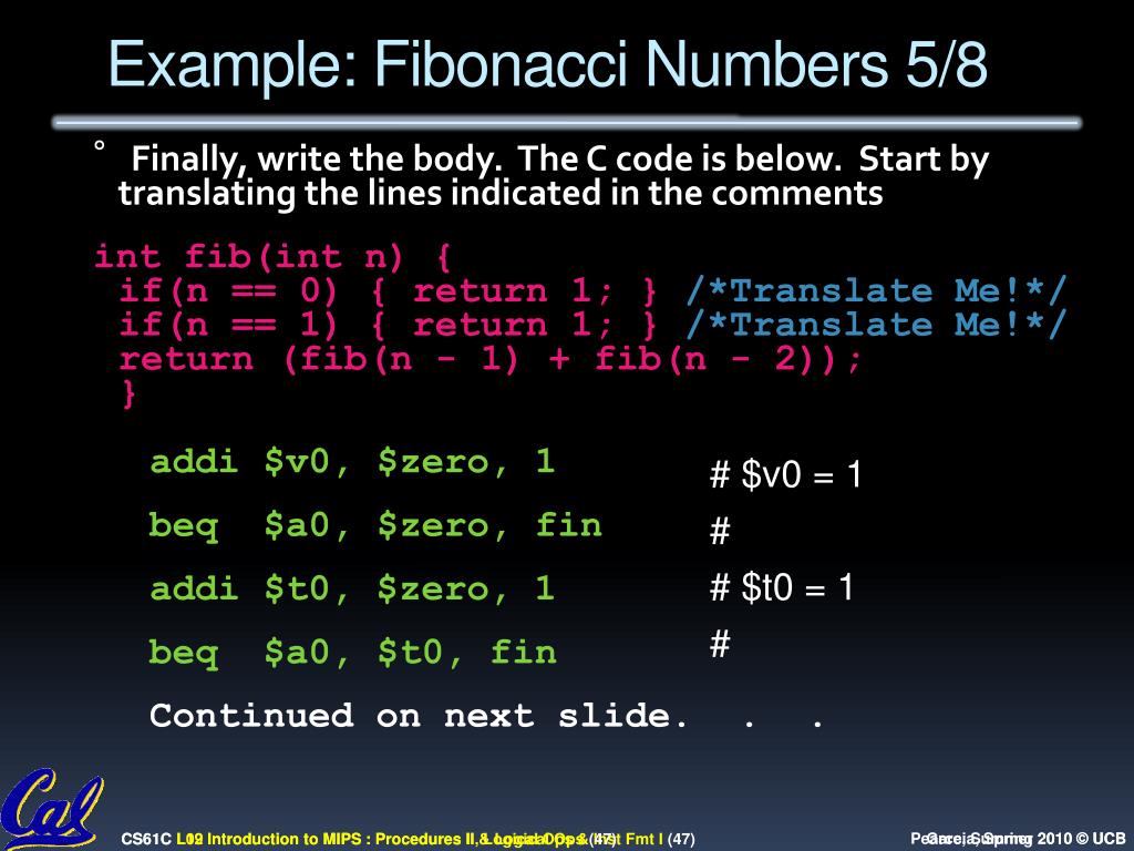 # $v0 = 1 # # $t0 = 1 # Example: Fibonacci Numbers 5/8 • Finally, write the body. The C code is below. Start by translating the lines indicated in the comments • intfib(intn) { if(n == 0) { return 1; } /*Translate Me!*/ if(n == 1) { return 1; } /*Translate Me!*/ return (fib(n - 1) + fib(n - 2));} addi $v0, $zero, 1 beq $a0, $zero, fin addi $t0, $zero, 1 beq $a0, $t0, fin Continued on next slide. . .