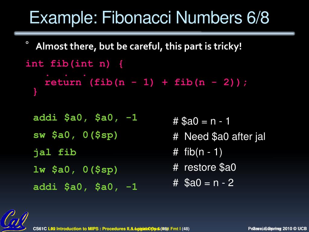 # $a0 = n - 1 # Need $a0 after jal # fib(n - 1) # restore $a0 # $a0 = n - 2 Example: Fibonacci Numbers 6/8 • Almost there, but be careful, this part is tricky! • intfib(intn) { . . . return (fib(n - 1) + fib(n - 2));} addi $a0, $a0, -1 sw $a0, 0($sp) jal fib lw $a0, 0($sp) addi $a0, $a0, -1