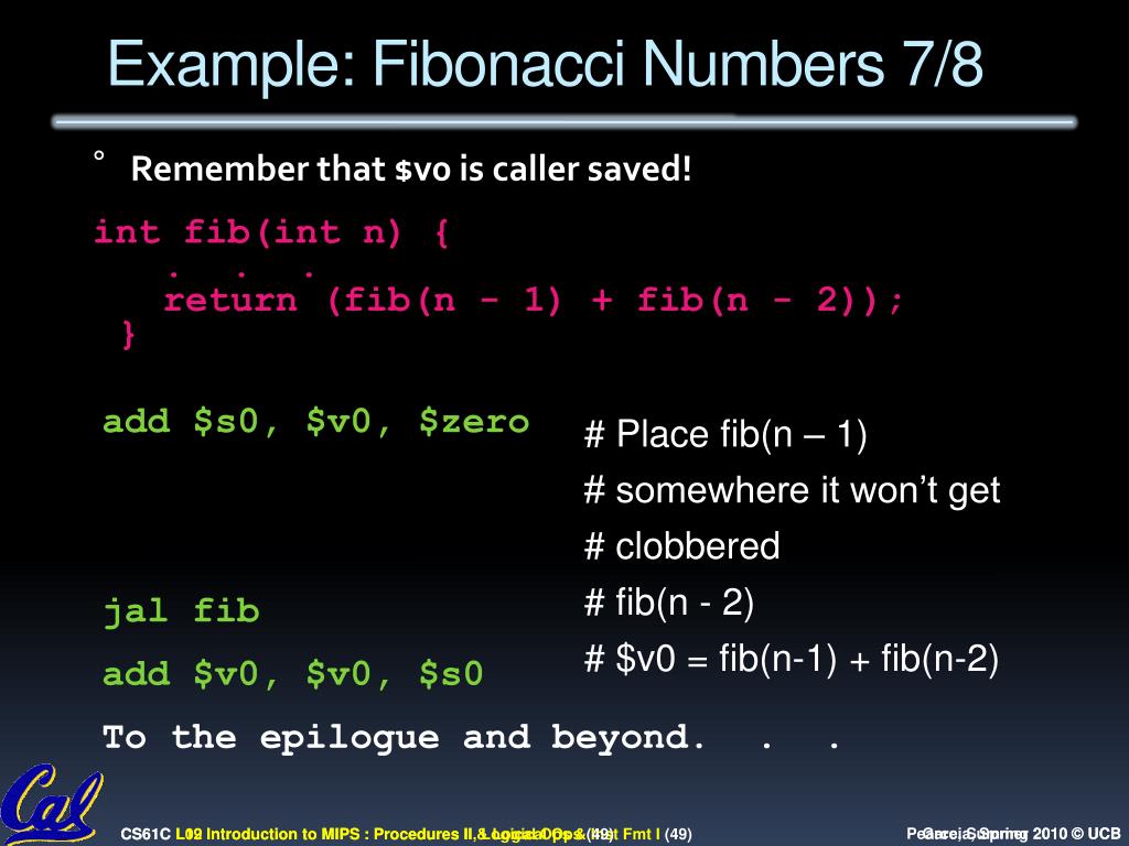 # Place fib(n – 1) # somewhere it won’t get # clobbered # fib(n - 2) # $v0 = fib(n-1) + fib(n-2) Example: Fibonacci Numbers 7/8 • Remember that $v0 is caller saved! • intfib(intn) { . . . return (fib(n - 1) + fib(n - 2));} add $s0, $v0, $zero jal fib add $v0, $v0, $s0 To the epilogue and beyond. . .