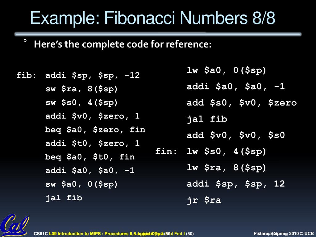 fin: lw $s0, 4($sp) lw $ra, 8($sp) addi $sp, $sp, 12 jr $ra # Restore $s0 # Restore return address # Pop the stack frame # Return to caller Example: Fibonacci Numbers 4/8 • Now write the Epilogue: