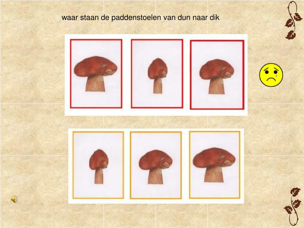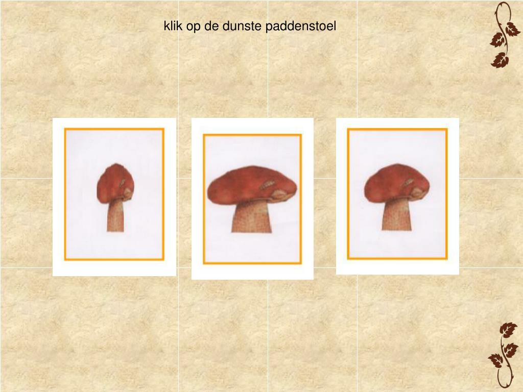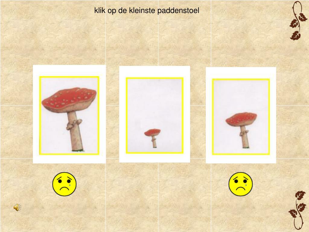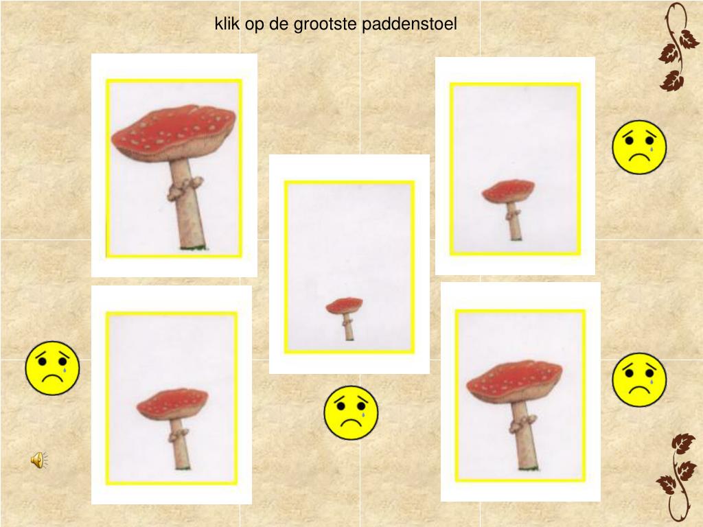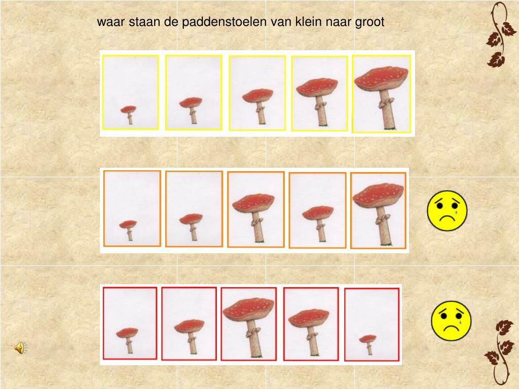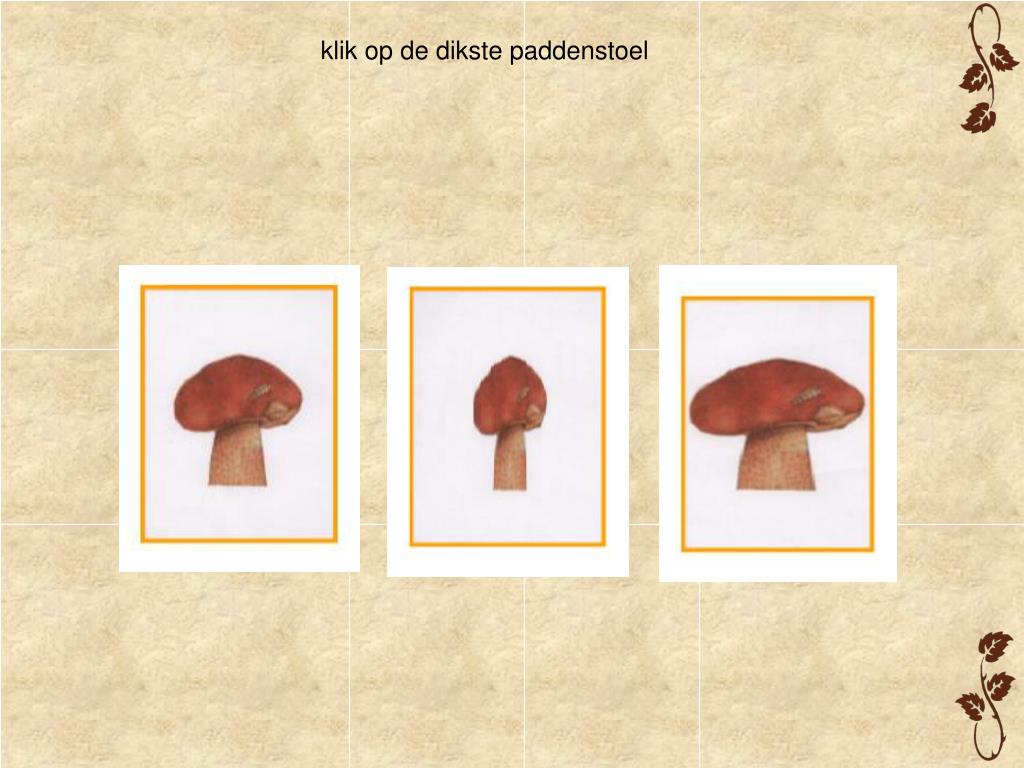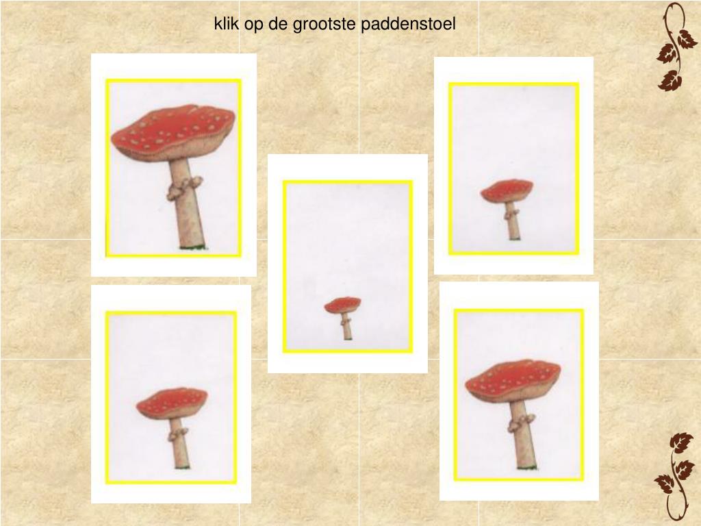 Digibordles seriëren herfst. over: groot/klein hoog/laag dik/dun licht/donker breed en smal. klik op een ster. makkelijk. moeilijk. Gemaakt door Margriet van Diepen. klik op de grootste paddenstoel. klik op de grootste paddenstoel. klik op de kleinste paddenstoel.