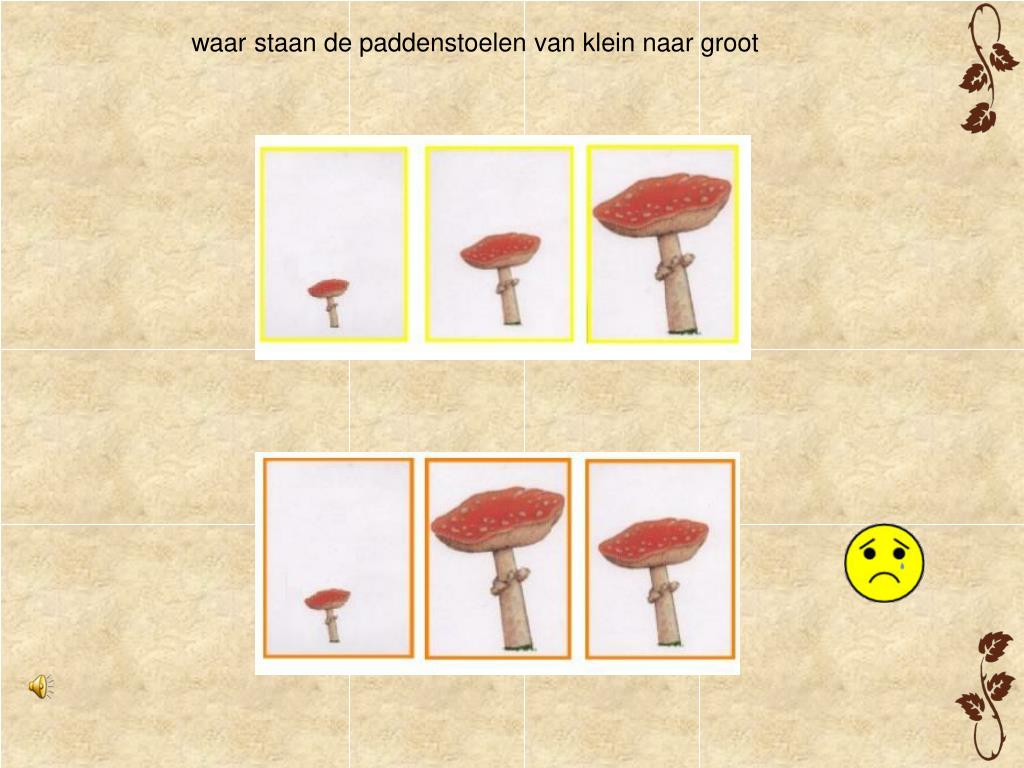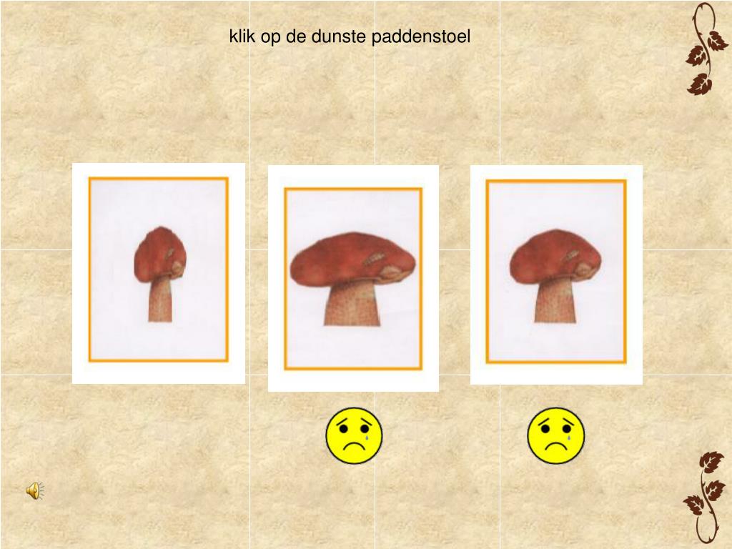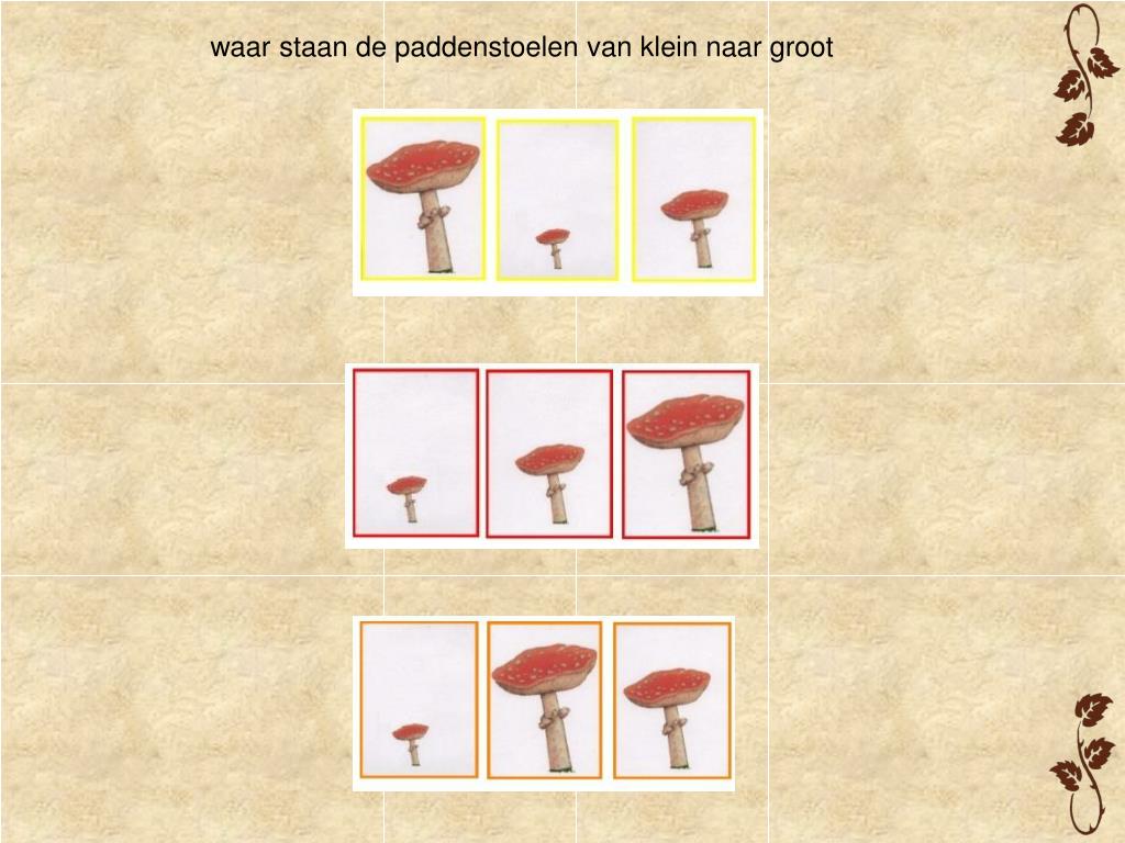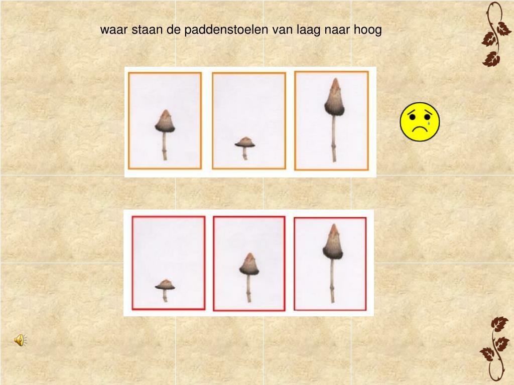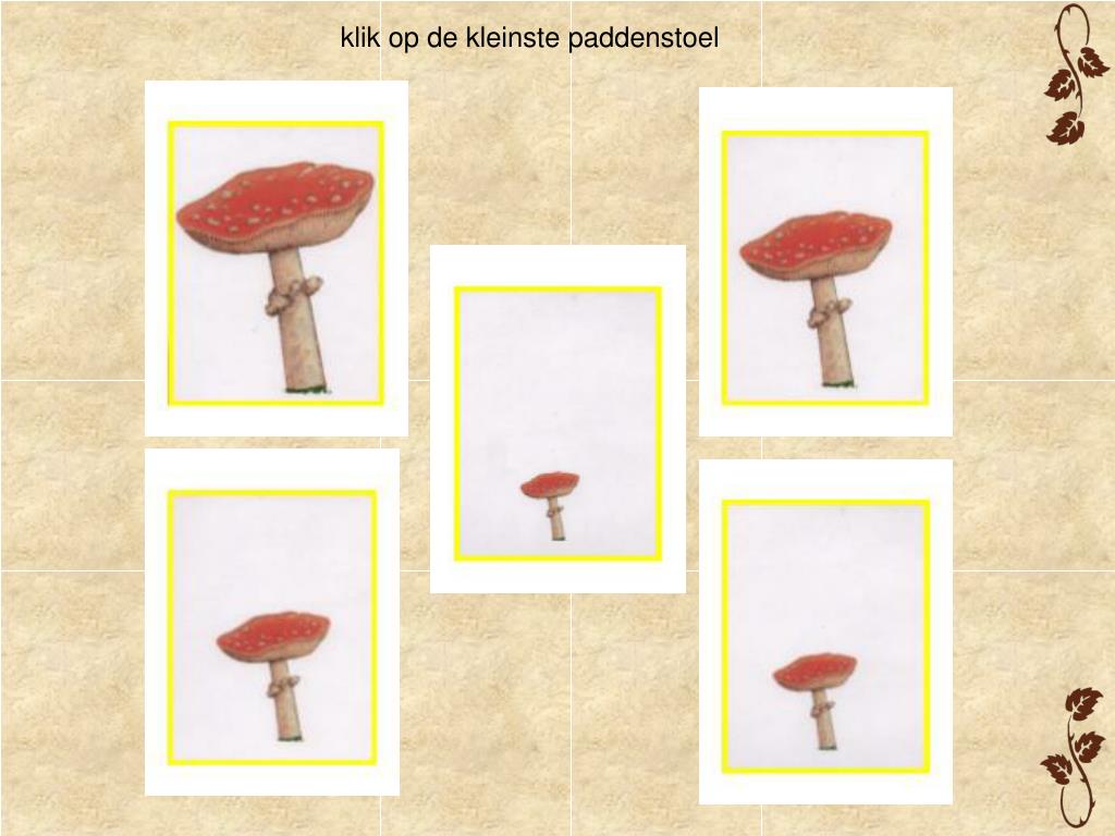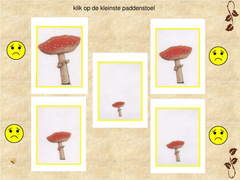 Digibordles seriëren herfst. over: groot/klein hoog/laag dik/dun licht/donker breed en smal. klik op een ster. makkelijk. moeilijk. Gemaakt door Margriet van Diepen. klik op de grootste paddenstoel. klik op de grootste paddenstoel. klik op de kleinste paddenstoel.