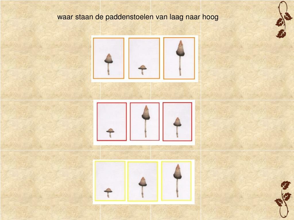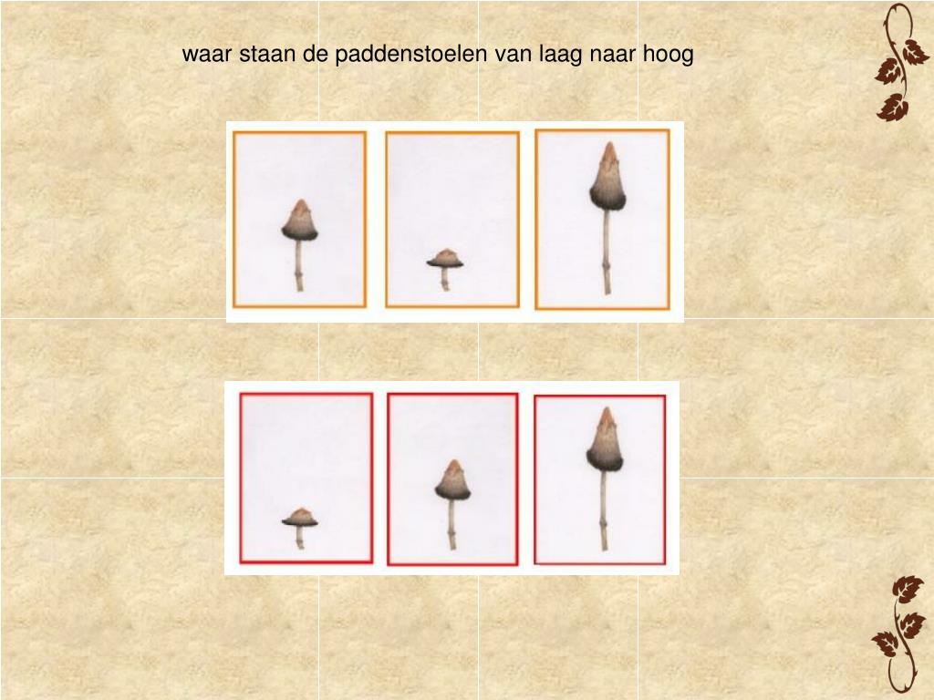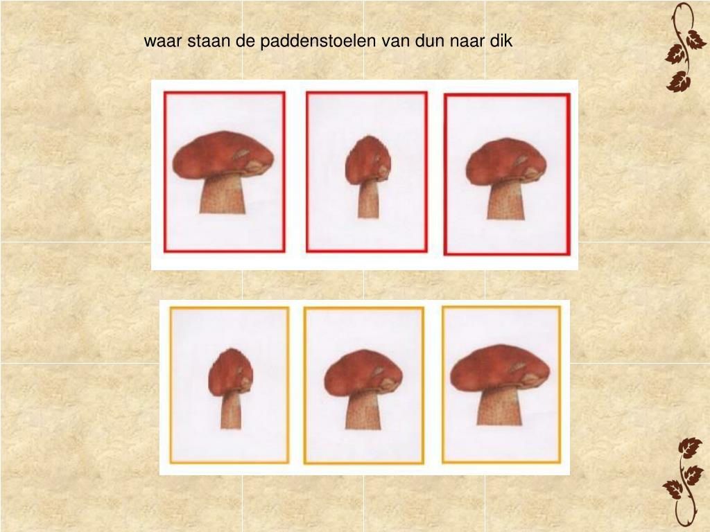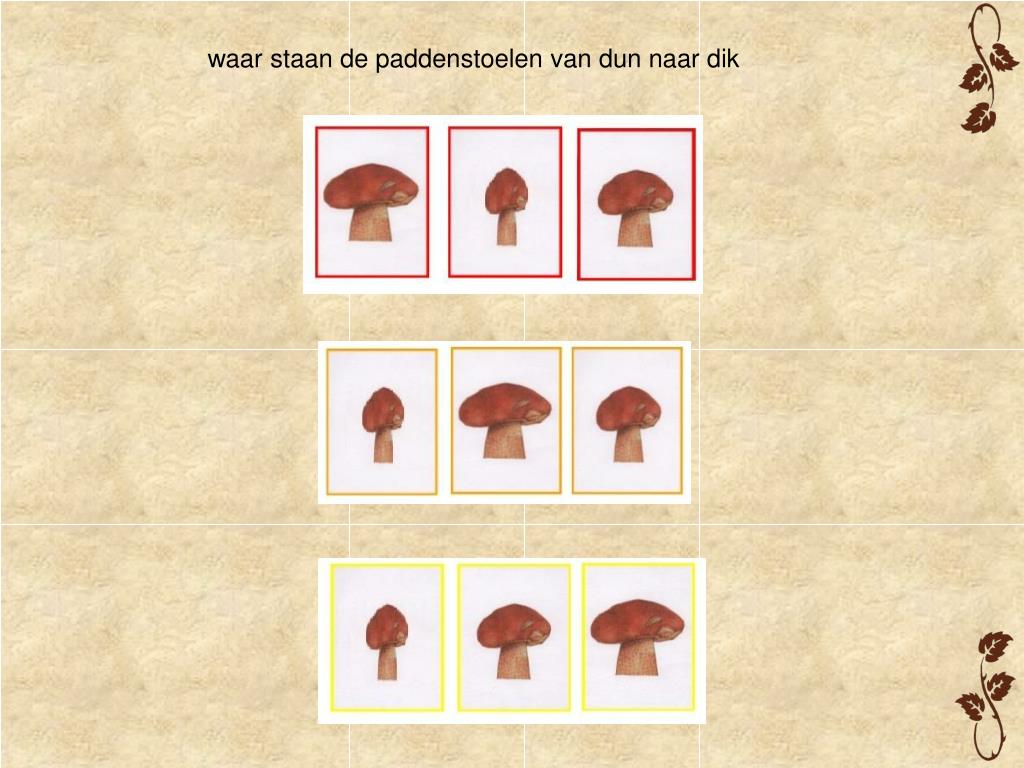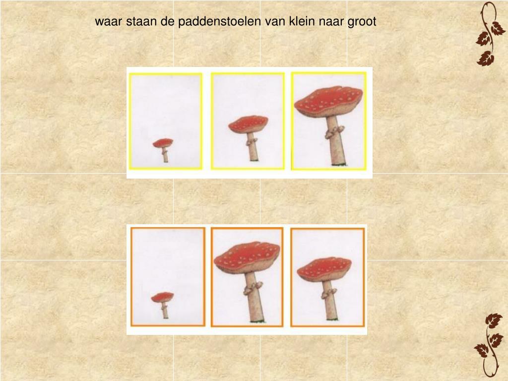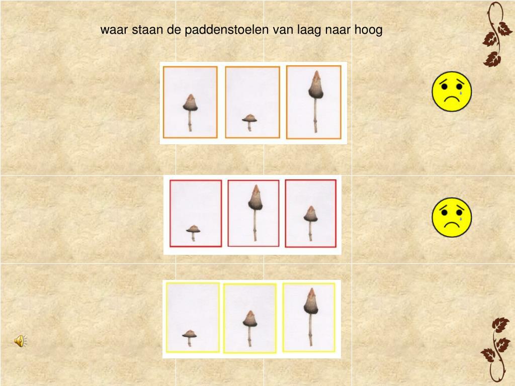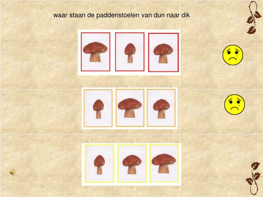 Digibordles seriëren herfst. over: groot/klein hoog/laag dik/dun licht/donker breed en smal. klik op een ster. makkelijk. moeilijk. Gemaakt door Margriet van Diepen. klik op de grootste paddenstoel. klik op de grootste paddenstoel. klik op de kleinste paddenstoel.