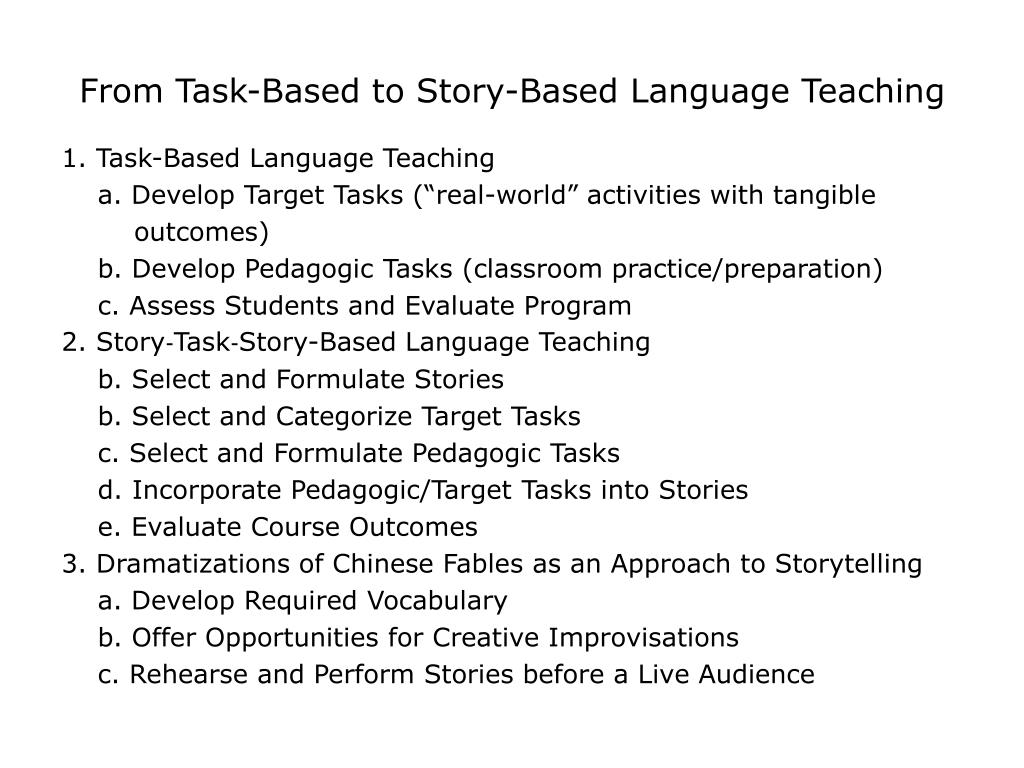 From Task-Based to Story-Based Language Teaching 1. Task-Based Language Teaching a. Develop Target Tasks (“real-world” activities with tangible outcomes) b. Develop Pedagogic Tasks (classroom practice/preparation) c. Assess Students and Evaluate Program 2. Story‐Task‐Story-Based Language Teaching b. Select and Formulate Stories b. Select and Categorize Target Tasks c. Select and Formulate Pedagogic Tasks d. Incorporate Pedagogic/Target Tasks into Stories e. Evaluate Course Outcomes 3. Dramatizations of Chinese Fables as an Approach to Storytelling a. Develop Required Vocabulary b. Offer Opportunities for Creative Improvisations c. Rehearse and Perform Stories before a Live Audience