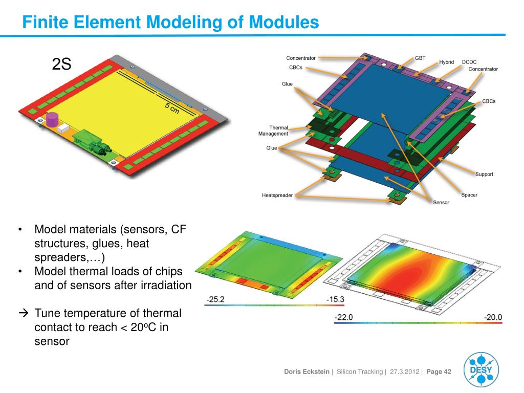 Finite Element Modeling of Modules • Model materials (sensors, CF structures, glues, heat spreaders,…) • Model thermal loads of chips and of sensors after irradiation • Tune temperature of thermal contact to reach < 20oC in sensor