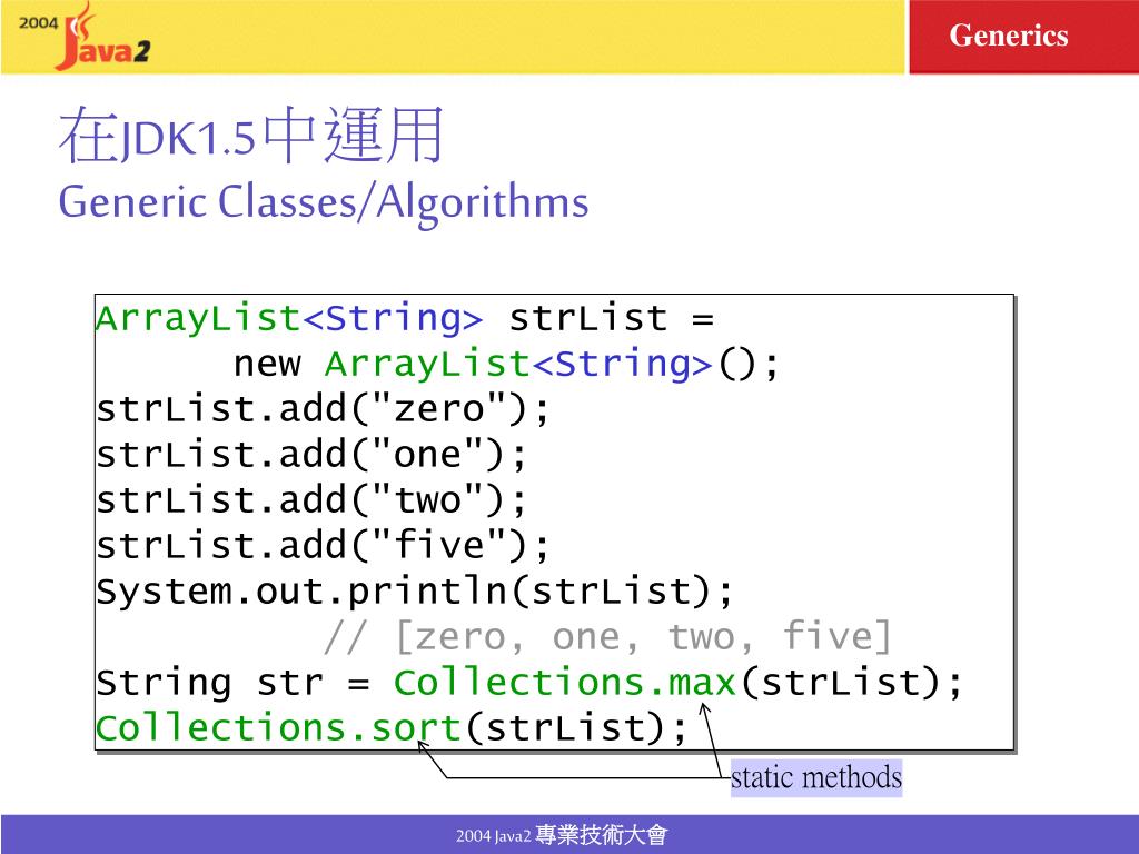 Generics 在JDK1.5中運用Generic Classes/Algorithms ArrayList<String> strList = new ArrayList<String>(); strList.add("zero"); strList.add("one"); strList.add("two"); strList.add("five"); System.out.println(strList); // [zero, one, two, five] String str = Collections.max(strList); Collections.sort(strList); static methods