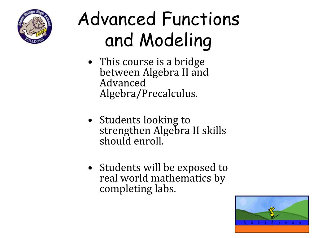 Advanced Functions and Modeling • This course is a bridge between Algebra II and Advanced Algebra/Precalculus. • Students looking to strengthen Algebra II skills should enroll. • Students will be exposed to real world mathematics by completing labs.