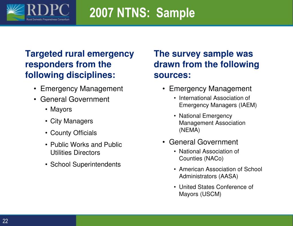 2007 NTNS: Sample Targeted rural emergency responders from the following disciplines: • Emergency Management • General Government • Mayors • City Managers • County Officials • Public Works and Public Utilities Directors • School Superintendents The survey sample was drawn from the following sources: • Emergency Management • International Association of Emergency Managers (IAEM) • National Emergency Management Association (NEMA) • General Government • National Association of Counties (NACo) • American Association of School Administrators (AASA) • United States Conference of Mayors (USCM) 22