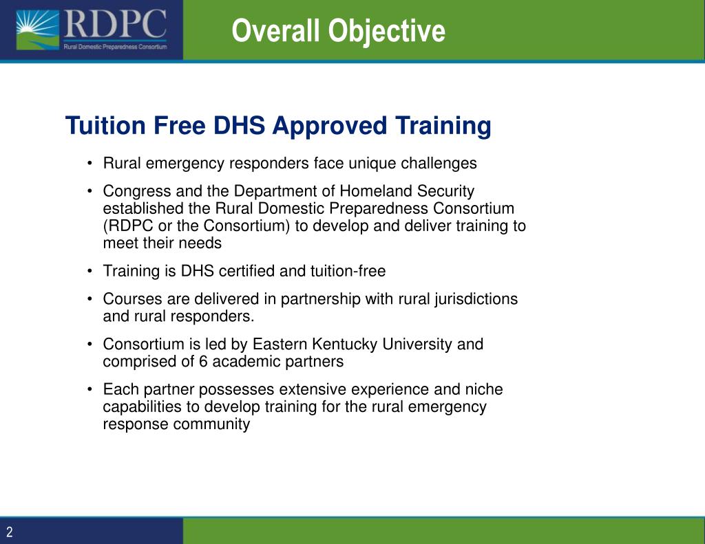 Overall Objective Tuition Free DHS Approved Training • Rural emergency responders face unique challenges • Congress and the Department of Homeland Security established the Rural Domestic Preparedness Consortium (RDPC or the Consortium) to develop and deliver training to meet their needs • Training is DHS certified and tuition-free • Courses are delivered in partnership with rural jurisdictions and rural responders. • Consortium is led by Eastern Kentucky University and comprised of 6 academic partners • Each partner possesses extensive experience and niche capabilities to develop training for the rural emergency response community 2