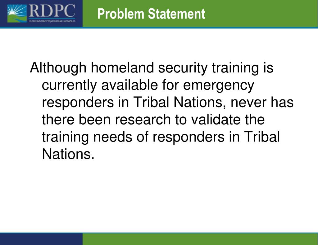 Problem Statement Although homeland security training is currently available for emergency responders in Tribal Nations, never has there been research to validate the training needs of responders in Tribal Nations.