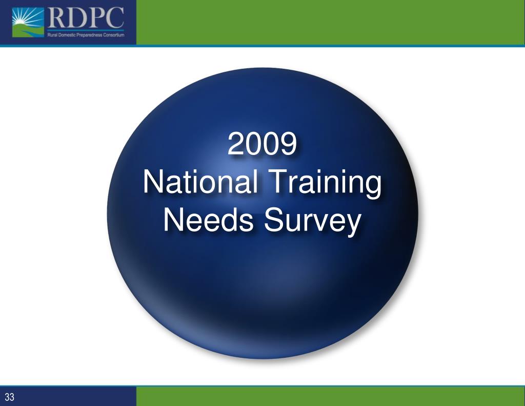 2007 NTNS: Key Findings Key Findings: Training Delivery • Training Delivery Method • Lecture/Seminar • Hands-On Exercises • Online • CD-ROM • Videoconferencing • Web Stream/Webcast • Correspondence Course • Training Location • Local • Regional • State • National 32