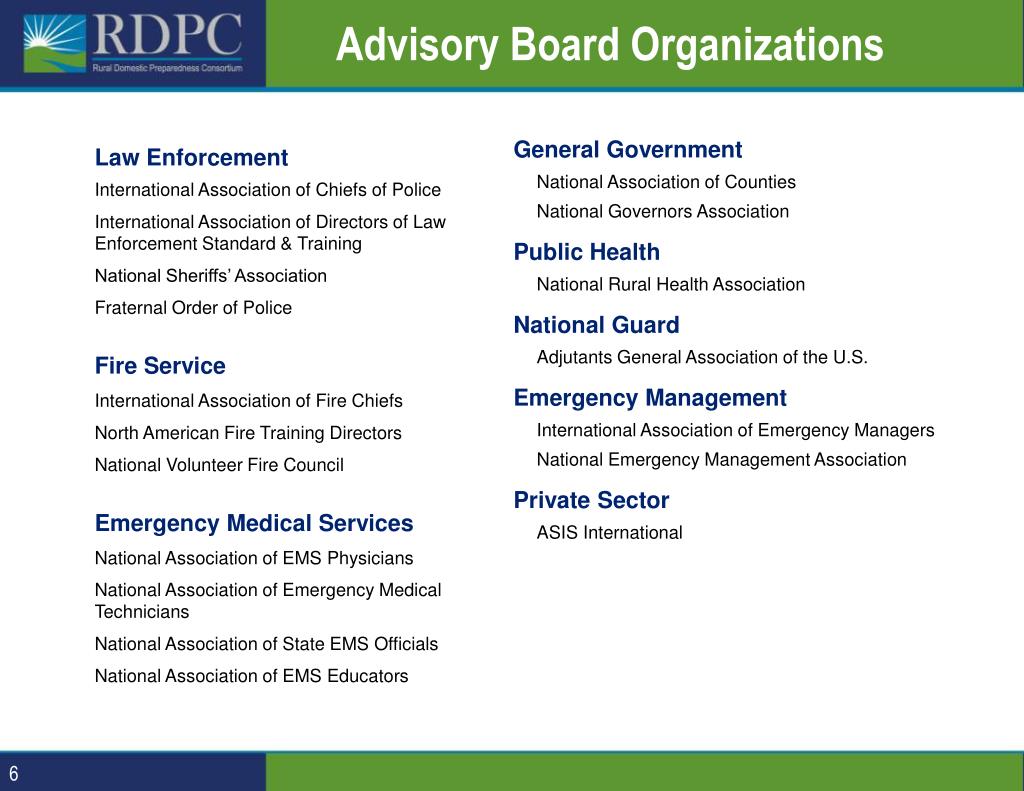Advisory Board Organizations Law Enforcement International Association of Chiefs of Police International Association of Directors of Law Enforcement Standard & Training National Sheriffs’ Association Fraternal Order of Police Fire Service International Association of Fire Chiefs North American Fire Training Directors National Volunteer Fire Council Emergency Medical Services National Association of EMS Physicians National Association of Emergency Medical Technicians National Association of State EMS Officials National Association of EMS Educators General Government National Association of Counties National Governors Association Public Health National Rural Health Association National Guard Adjutants General Association of the U.S. Emergency Management International Association of Emergency Managers National Emergency Management Association Private Sector ASIS International 6