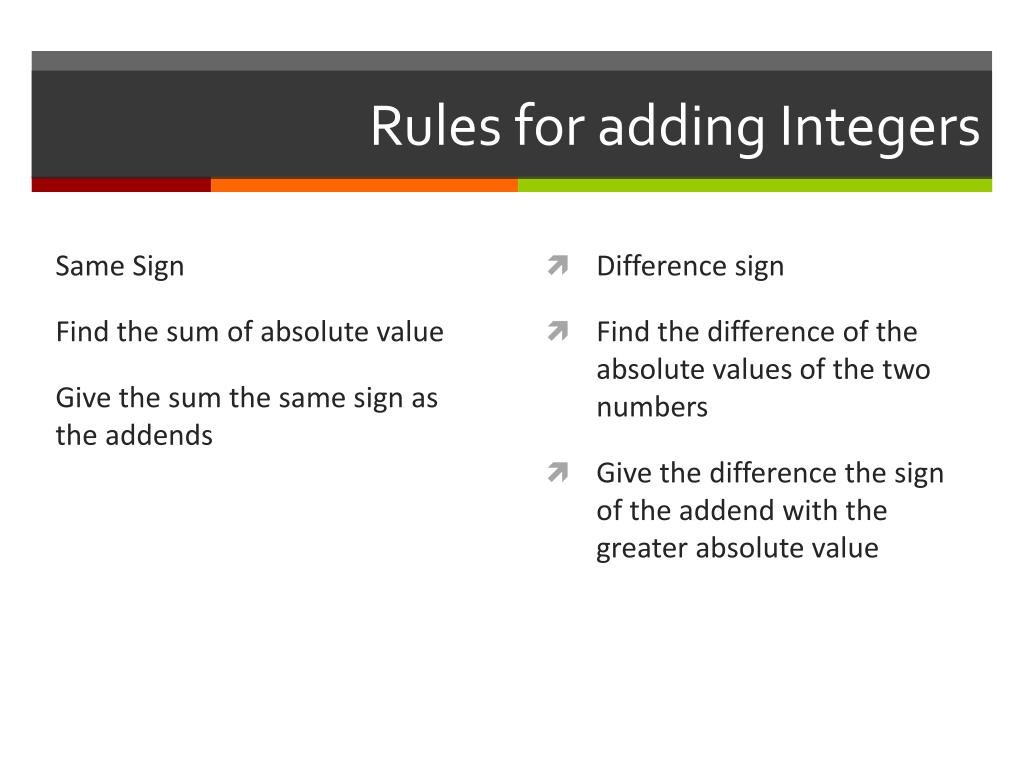 Rules for adding Integers Same Sign Find the sum of absolute value Give the sum the same sign as the addends • Difference sign • Find the difference of the absolute values of the two numbers • Give the difference the sign of the addend with the greater absolute value