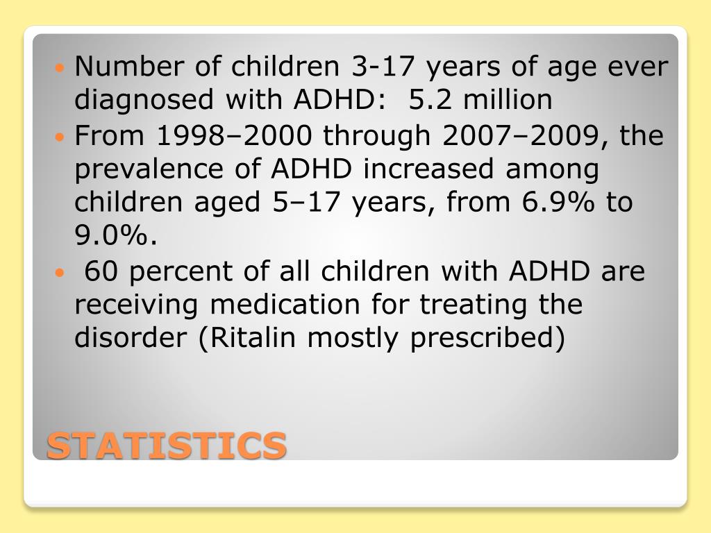 Number of children 3-17 years of age ever diagnosed with ADHD: 5.2 million • From 1998–2000 through 2007–2009, the prevalence of ADHD increased among children aged 5–17 years, from 6.9% to 9.0%. • 60 percent of all children with ADHD are receiving medication for treating the disorder (Ritalin mostly prescribed) STATISTICS
