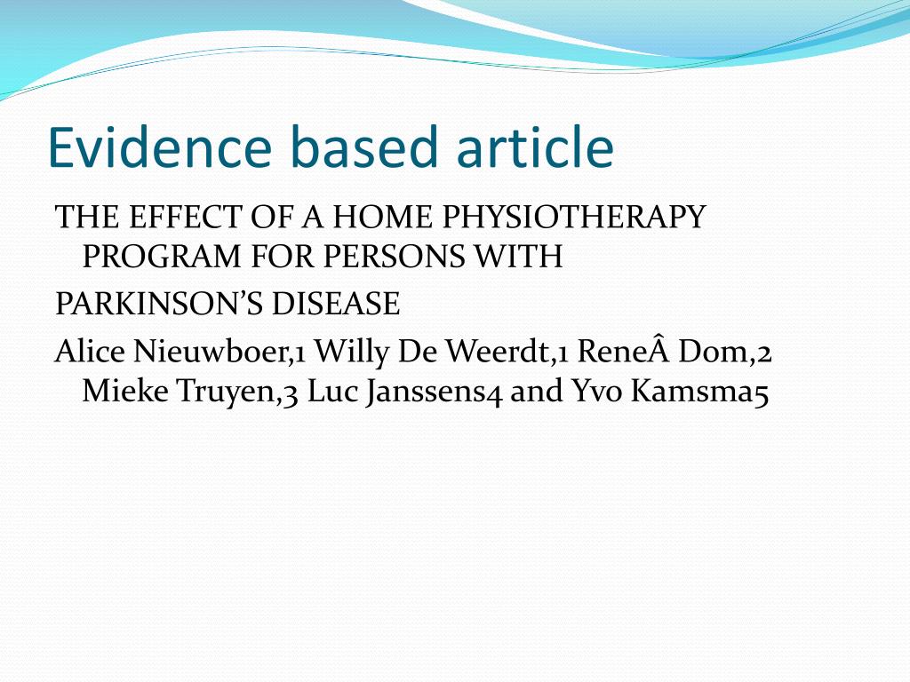 Evidence based article THE EFFECT OF A HOME PHYSIOTHERAPY PROGRAM FOR PERSONS WITH PARKINSON’S DISEASE Alice Nieuwboer,1 Willy De Weerdt,1 Rene Dom,2 Mieke Truyen,3 Luc Janssens4 and Yvo Kamsma5