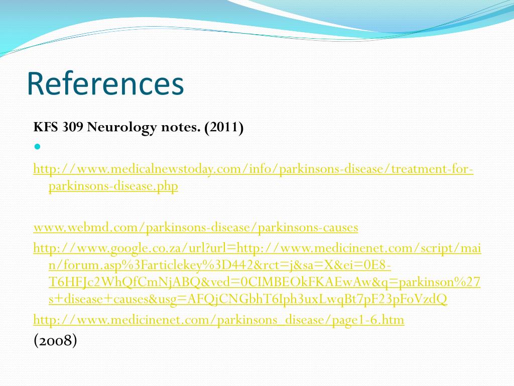 References KFS 309 Neurology notes. (2011) http://www.medicalnewstoday.com/info/parkinsons-disease/treatment-for-parkinsons-disease.php www.webmd.com/parkinsons-disease/parkinsons-causes http://www.google.co.za/url?url=http://www.medicinenet.com/script/main/forum.asp%3Farticlekey%3D442&rct=j&sa=X&ei=0E8-T6HFJc2WhQfCmNjABQ&ved=0CIMBEOkFKAEwAw&q=parkinson%27s+disease+causes&usg=AFQjCNGbhT6Iph3uxLwqBt7pF23pFoVzdQ http://www.medicinenet.com/parkinsons_disease/page1-6.htm (2008)