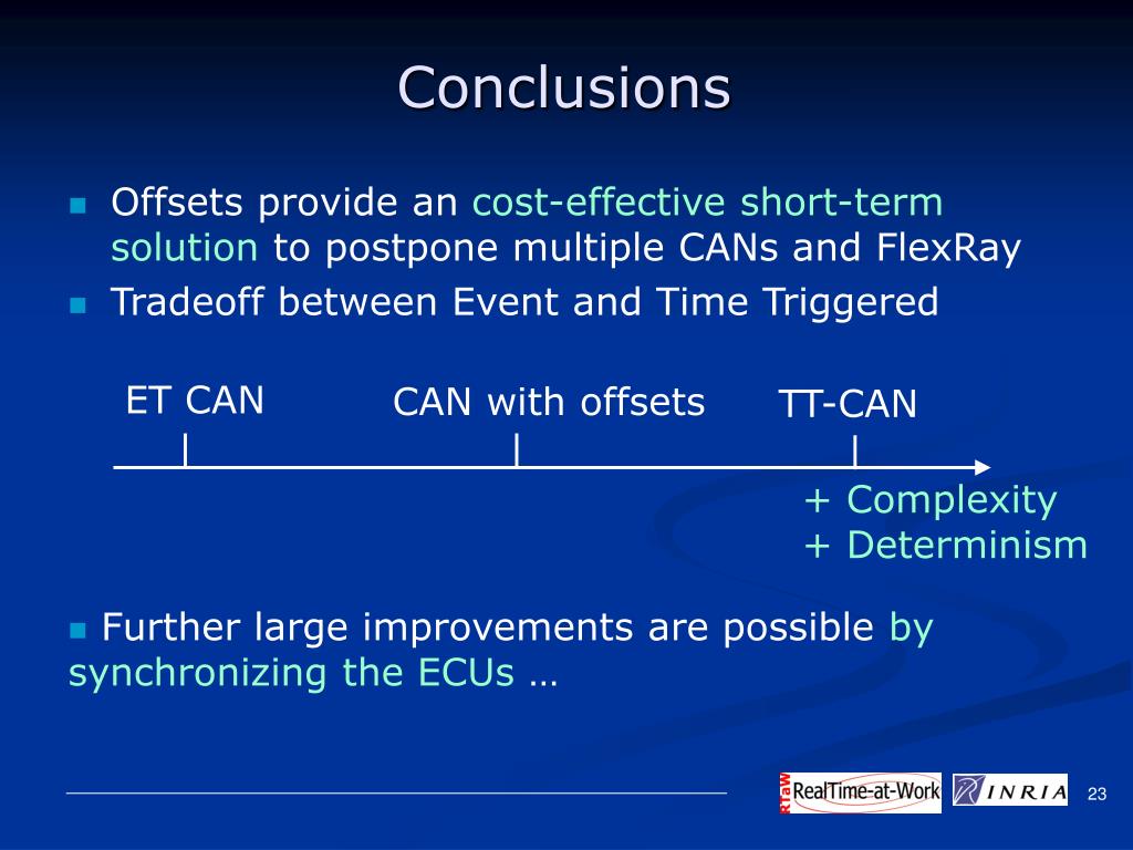 ET CAN CAN with offsets TT-CAN + Complexity+ Determinism Conclusions • Offsets provide an cost-effective short-term solution to postpone multiple CANs and FlexRay • Tradeoff between Event and Time Triggered • Further large improvements are possible by synchronizing the ECUs …