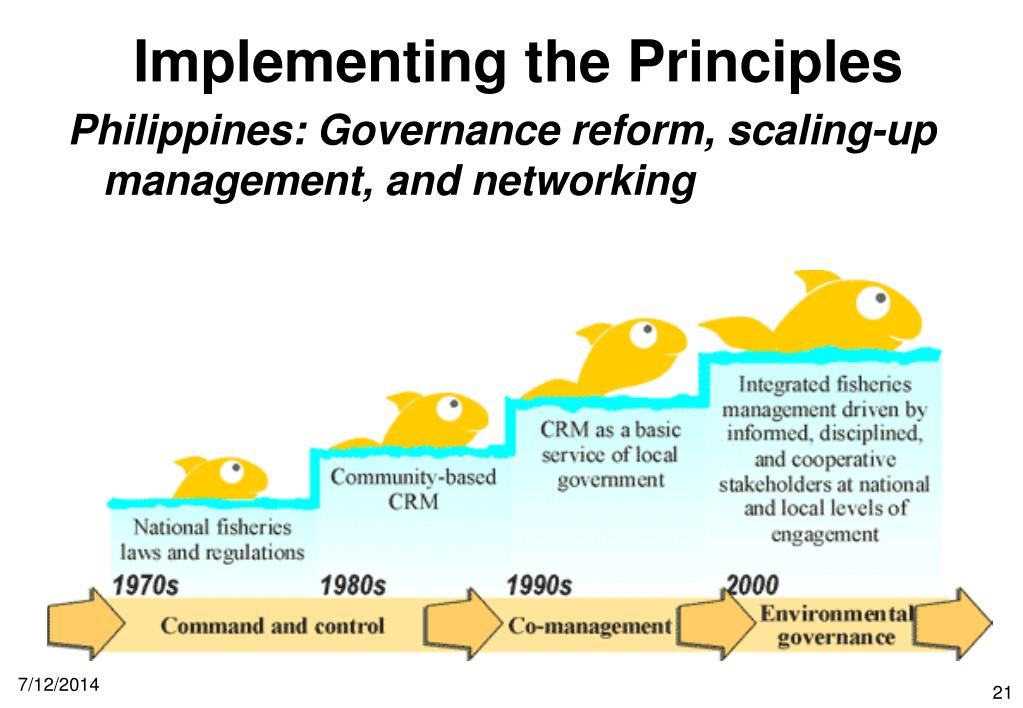 Implementing the Principles Philippines: Governance reform, scaling-up management, and networking Four large programs/projects: • FSP (ADB 1989-1996) • FRMP (ADB/Japan 1998-2007) • CRMP (USAID 1996-2004) • FISH (USAID 2003-2010) • These four projects build on one another to improve fisheries governance 7/12/2014 20