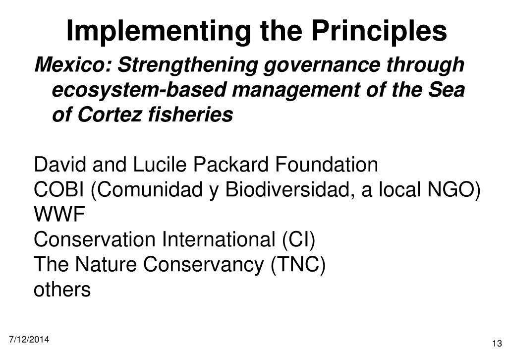 Implementing the Principles Mexico: Strengthening governance through ecosystem-based management of the Sea of Cortez fisheries David and Lucile Packard Foundation COBI (Comunidad y Biodiversidad, a local NGO) WWF Conservation International (CI) The Nature Conservancy (TNC) others 7/12/2014 13
