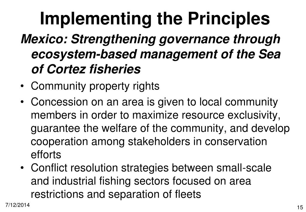 Implementing the Principles Mexico: Strengthening governance through ecosystem-based management of the Sea of Cortez fisheries • Co-management in context of decentralization • Active participation of fishers through community organizations • Empowerment to participate in decision-making 7/12/2014 14