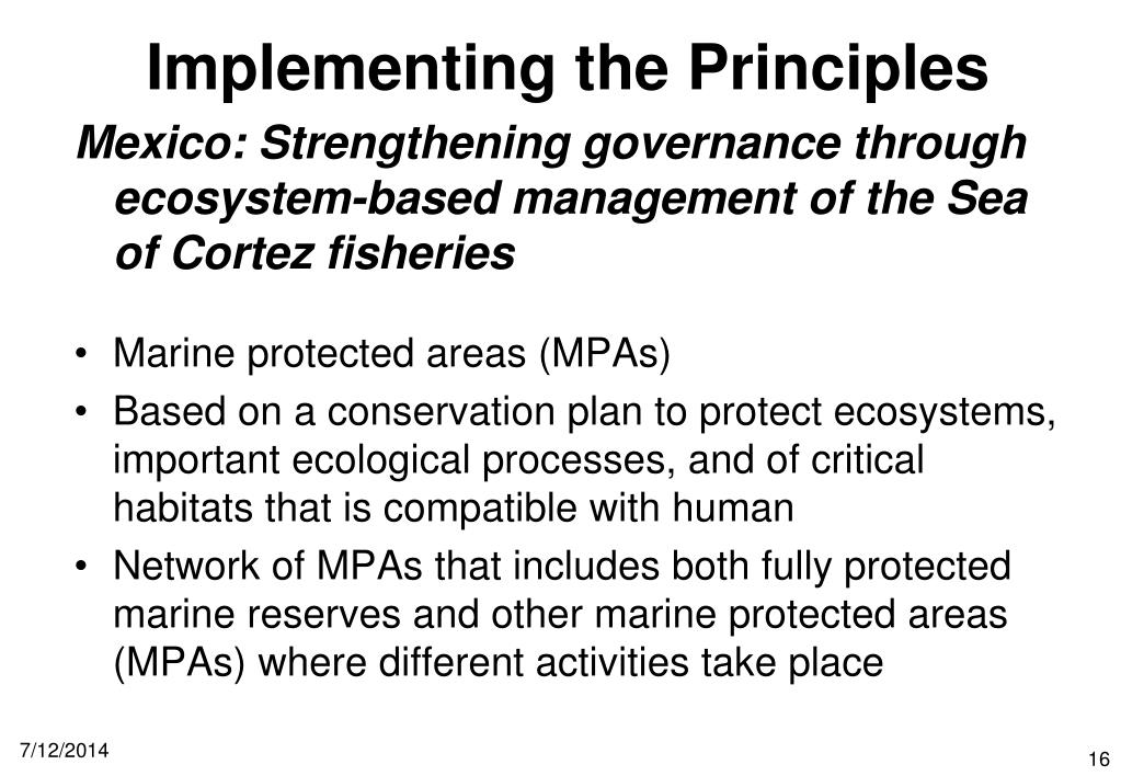 Implementing the Principles Mexico: Strengthening governance through ecosystem-based management of the Sea of Cortez fisheries • Community property rights • Concession on an area is given to local community members in order to maximize resource exclusivity, guarantee the welfare of the community, and develop cooperation among stakeholders in conservation efforts • Conflict resolution strategies between small-scale and industrial fishing sectors focused on area restrictions and separation of fleets 7/12/2014 15