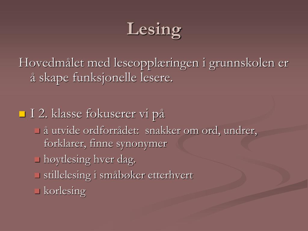 Lesing Hovedmålet med leseopplæringen i grunnskolen er å skape funksjonelle lesere. • I 2. klasse fokuserer vi på • å utvide ordforrådet: snakker om ord, undrer, forklarer, finne synonymer • høytlesing hver dag. • stillelesing i småbøker etterhvert • korlesing