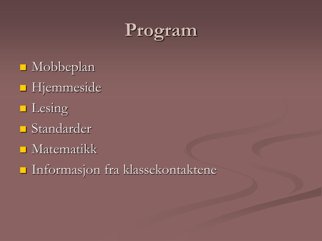 Program Mobbeplan Hjemmeside Lesing Standarder Matematikk Informasjon fra klassekontaktene