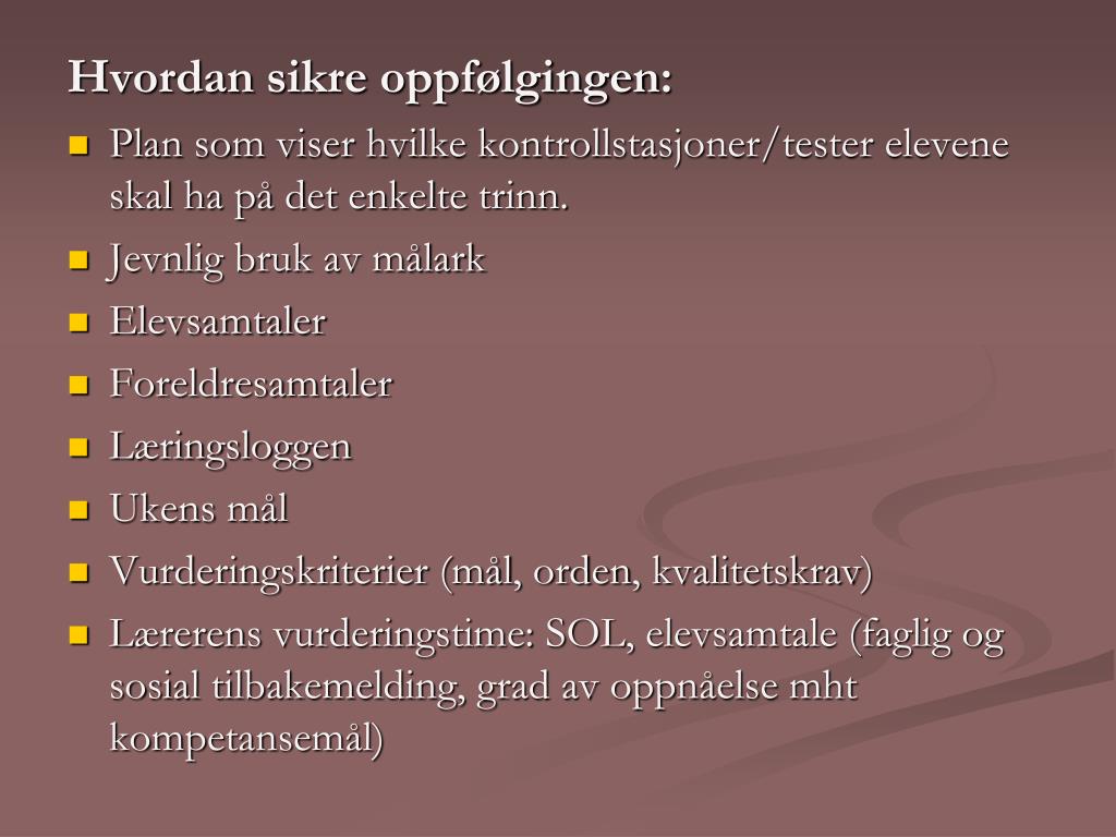 Hvordansikreoppfølgingen: Plan som viser hvilke kontrollstasjoner/tester elevene skal ha på det enkelte trinn. Jevnlig bruk av målark Elevsamtaler Foreldresamtaler Læringsloggen Ukensmål Vurderingskriterier (mål, orden, kvalitetskrav) Lærerens vurderingstime: SOL, elevsamtale (faglig og sosial tilbakemelding, grad av oppnåelse mht kompetansemål)