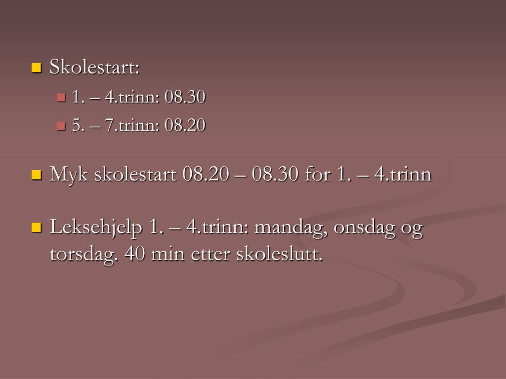 Skolestart: • 1. – 4.trinn: 08.30 • 5. – 7.trinn: 08.20 • Myk skolestart 08.20 – 08.30 for 1. – 4.trinn • Leksehjelp 1. – 4.trinn: mandag, onsdag og torsdag. 40 min etter skoleslutt.