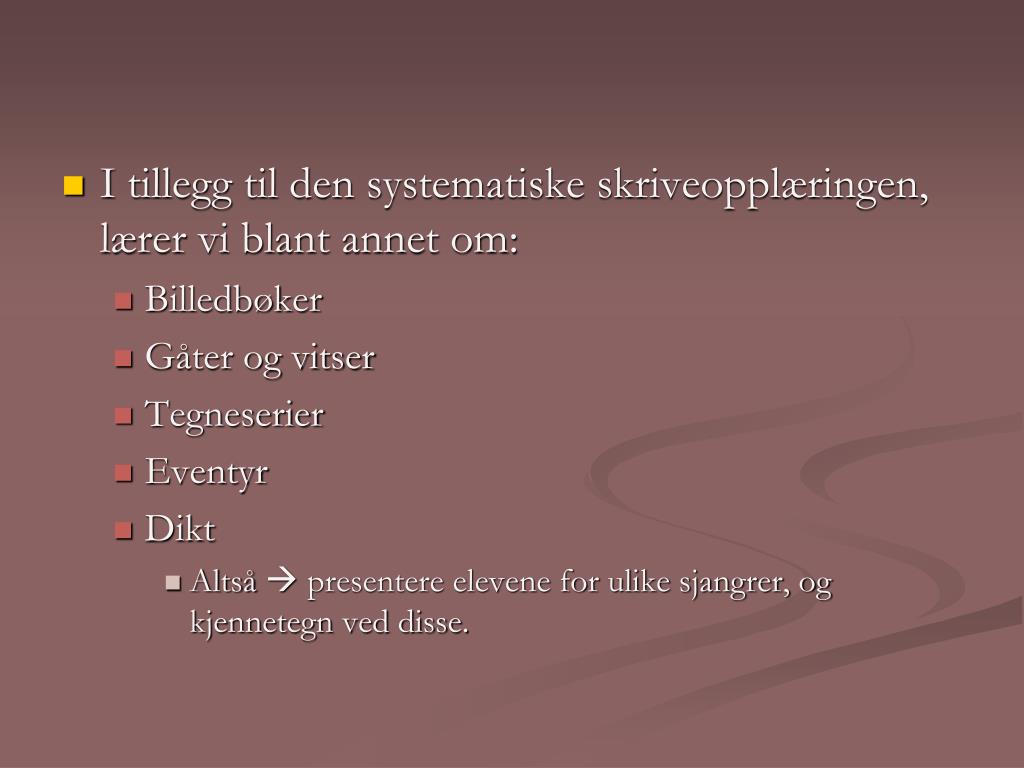 I tillegg til den systematiske skriveopplæringen, lærer vi blant annet om: • Billedbøker • Gåter og vitser • Tegneserier • Eventyr • Dikt • Altså presentere elevene for ulike sjangrer, og kjennetegn ved disse.