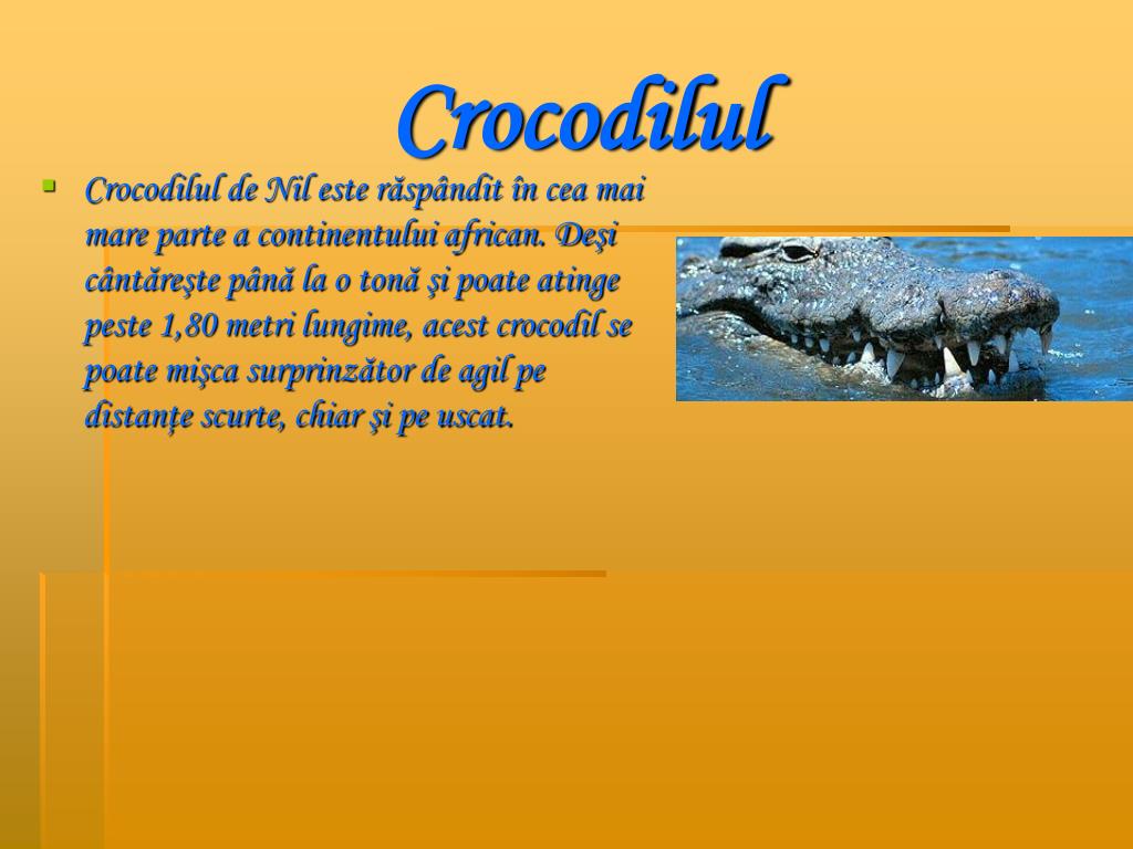 Crocodilul • Crocodilul de Nil este răspândit în cea mai mare parte a continentului african. Deşi cântăreşte până la o tonă şi poate atinge peste 1,80 metri lungime, acest crocodil se poate mişca surprinzător de agil pe distanţe scurte, chiar şi pe uscat.