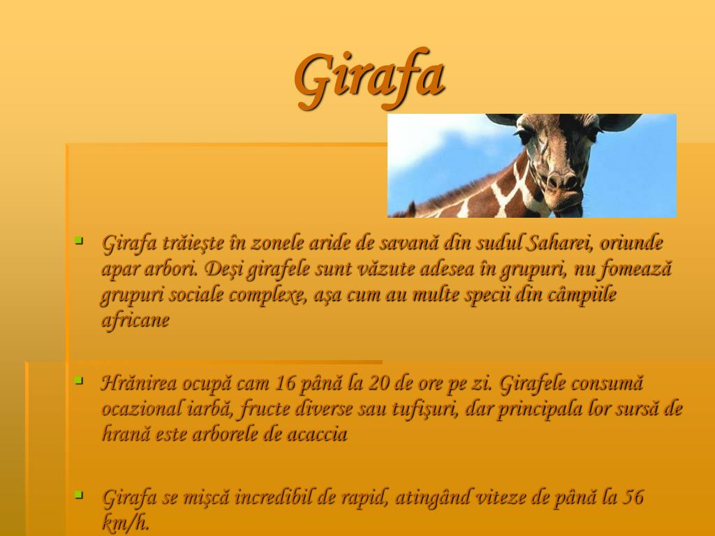 Girafa • Girafa trăieşte în zonele aride de savană din sudul Saharei, oriunde apar arbori. Deşi girafele sunt văzute adesea în grupuri, nu fomează grupuri sociale complexe, aşa cum au multe specii din câmpiile africane • Hrănirea ocupă cam 16 până la 20 de ore pe zi. Girafele consumă ocazional iarbă, fructe diverse sau tufişuri, dar principala lor sursă de hrană este arborele de acaccia • Girafa se mişcă incredibil de rapid, atingând viteze de până la 56 km/h.