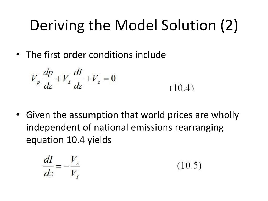 Deriving the Model Solution (2) • The first order conditions include • Given the assumption that world prices are wholly independent of national emissions rearranging equation 10.4 yields