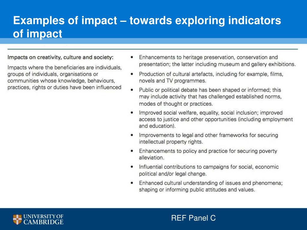Examples of impact – towards exploring indicators of impact REF Panel C