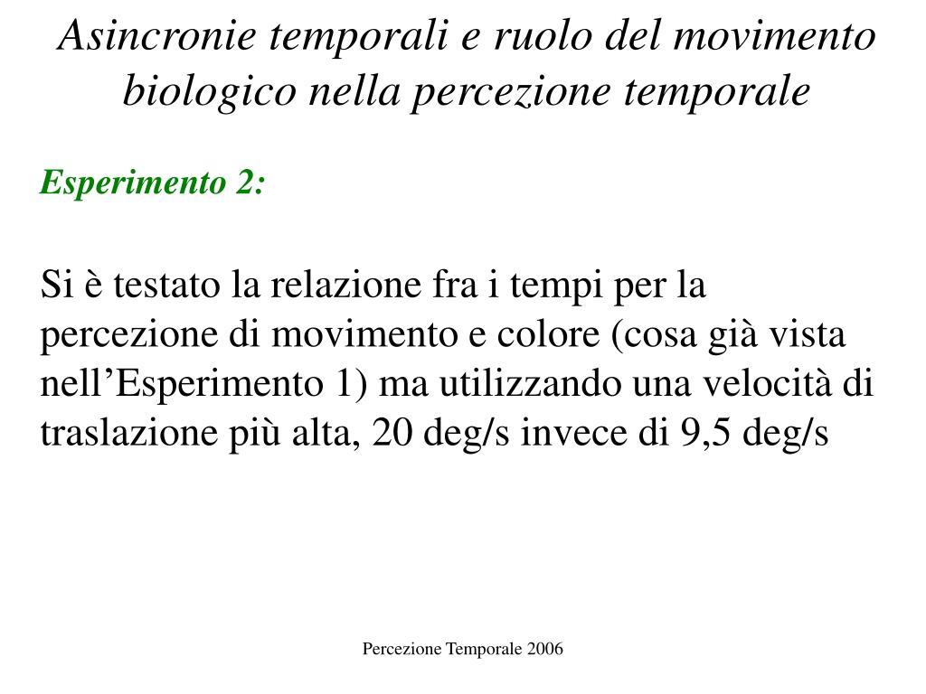 Asincronie temporali e ruolo del movimento biologico nella percezione temporale Esperimento 2: Si è testato la relazione fra i tempi per la percezione di movimento e colore (cosa già vista nell’Esperimento 1) ma utilizzando una velocità di traslazione più alta, 20 deg/s invece di 9,5 deg/s Percezione Temporale 2006