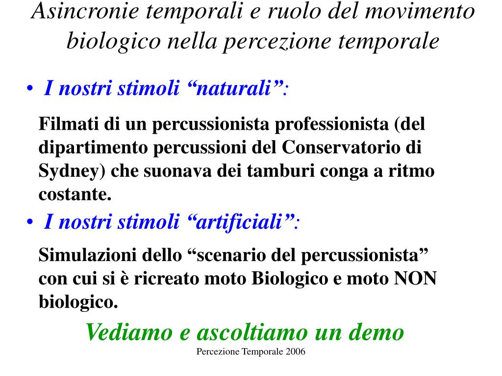 Asincronie temporali e ruolo del movimento biologico nella percezione temporale • I nostri stimoli “naturali”: Filmati di un percussionista professionista (del dipartimento percussioni del Conservatorio di Sydney) che suonava dei tamburi conga a ritmo costante. • I nostri stimoli “artificiali”: Simulazioni dello “scenario del percussionista” con cui si è ricreato moto Biologico e moto NON biologico. Vediamo e ascoltiamo un demo Percezione Temporale 2006