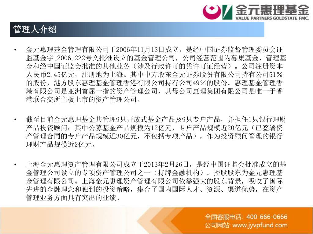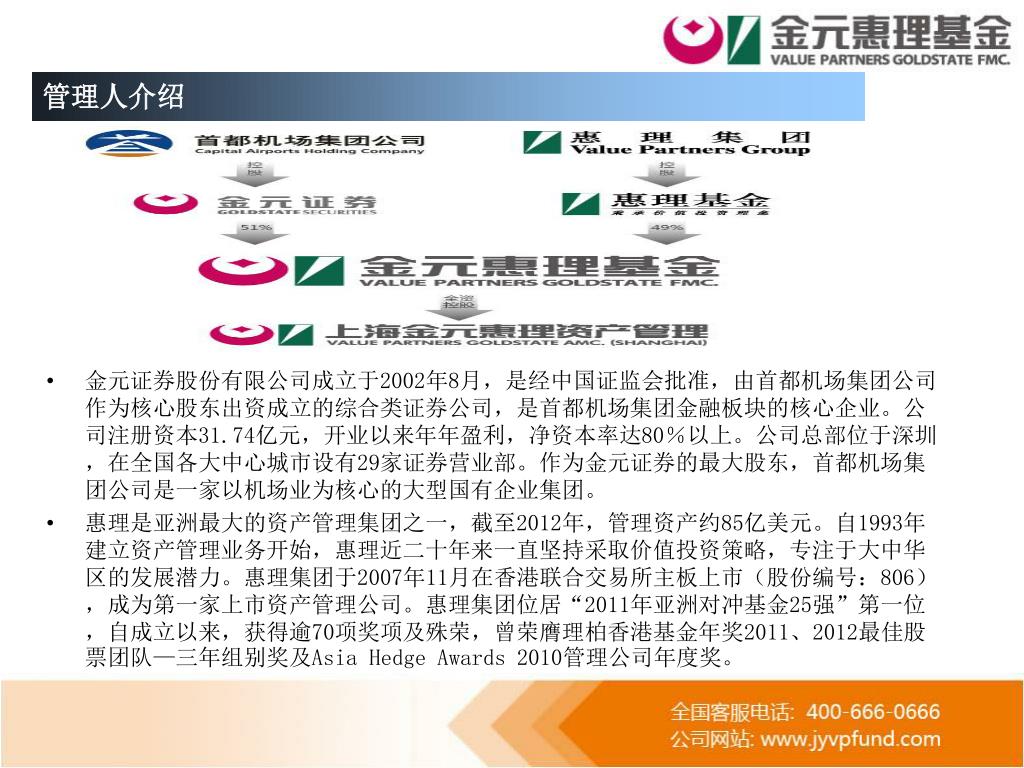 金元证券股份有限公司成立于2002年8月,是经中国证监会批准,由首都机场集团公司作为核心股东出资成立的综合类证券公司,是首都机场集团金融板块的核心企业。公司注册资本31.74亿元,开业以来年年盈利,净资本率达80%以上。公司总部位于深圳,在全国各大中心城市设有29家证券营业部。作为金元证券的最大股东,首都机场集团公司是一家以机场业为核心的大型国有企业集团。金元证券股份有限公司成立于2002年8月,是经中国证监会批准,由首都机场集团公司作为核心股东出资成立的综合类证券公司,是首都机场集团金融板块的核心企业。公司注册资本31.74亿元,开业以来年年盈利,净资本率达80%以上。公司总部位于深圳,在全国各大中心城市设有29家证券营业部。作为金元证券的最大股东,首都机场集团公司是一家以机场业为核心的大型国有企业集团。 • 惠理是亚洲最大的资产管理集团之一,截至2012年,管理资产约85亿美元。自1993年建立资产管理业务开始,惠理近二十年来一直坚持采取价值投资策略,专注于大中华区的发展潜力。惠理集团于2007年11月在香港联合交易所主板上市(股份编号:806),成为第一家上市资产管理公司。惠理集团位居“2011年亚洲对冲基金25强”第一位,自成立以来,获得逾70项奖项及殊荣,曾荣膺理柏香港基金年奖2011、2012最佳股票团队—三年组别奖及Asia Hedge Awards 2010管理公司年度奖。 管理人介绍