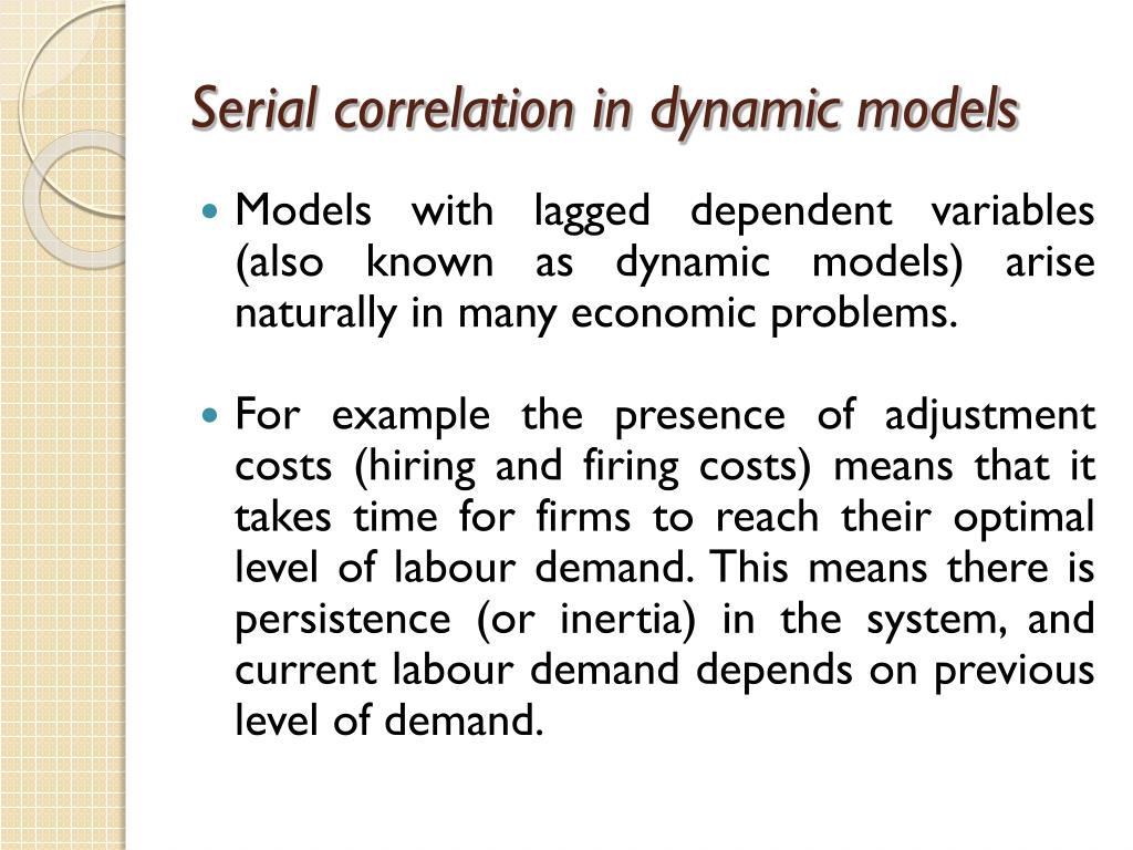 Serial correlation in dynamic models • Models with lagged dependent variables (also known as dynamic models) arise naturally in many economic problems. • For example the presence of adjustment costs (hiring and firing costs) means that it takes time for firms to reach their optimal level of labour demand. This means there is persistence (or inertia) in the system, and current labour demand depends on previous level of demand.