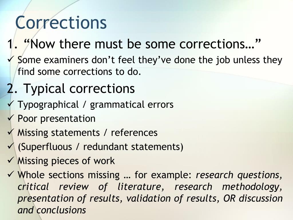 Corrections • “Now there must be some corrections…” • Some examiners don’t feel they’ve done the job unless they find some corrections to do. • Typical corrections • Typographical / grammatical errors • Poor presentation • Missing statements / references • (Superfluous / redundant statements) • Missing pieces of work • Whole sections missing … for example: research questions, critical review of literature, research methodology, presentation of results, validation of results, OR discussion and conclusions