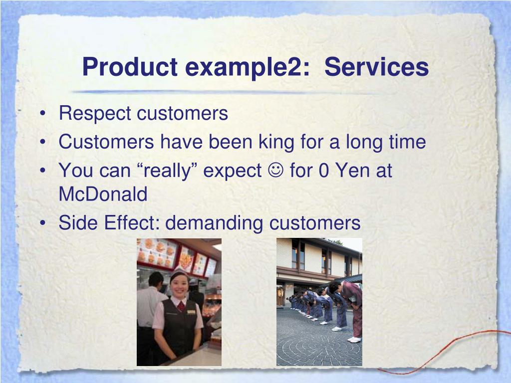 Product example2: Services • Respect customers • Customers have been king for a long time • You can “really” expect for 0 Yen at McDonald • Side Effect: demanding customers