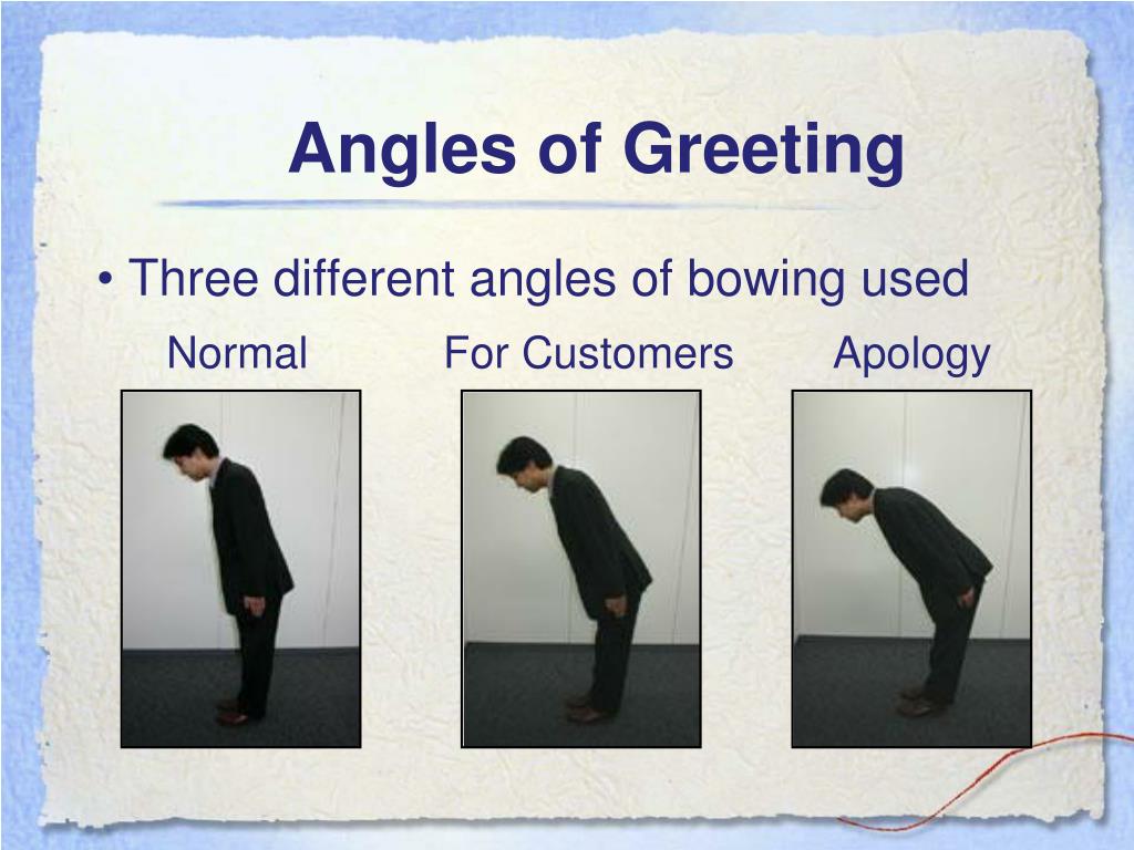 Angles of Greeting • Three different angles of bowing used Normal For Customers Apology