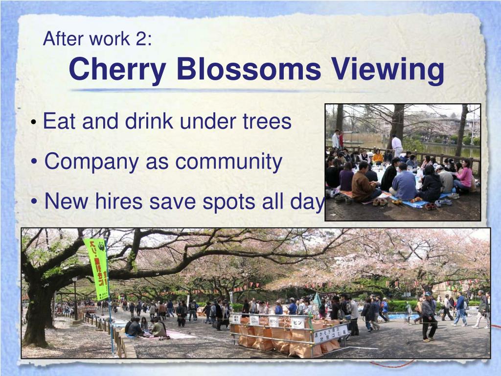 After work 2: Cherry Blossoms Viewing • Eat and drink under trees • Company as community • New hires save spots all day