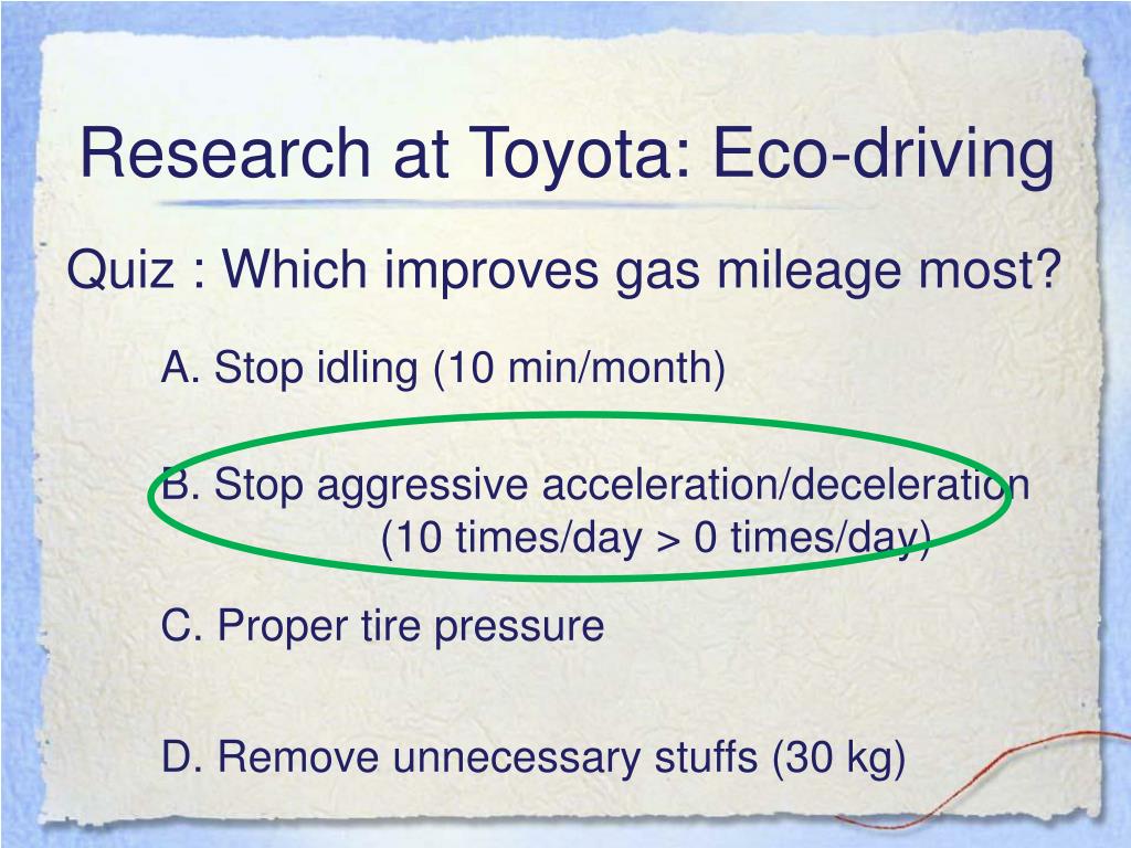 Research at Toyota: Eco-driving Quiz : Which improves gas mileage most? A. Stop idling (10 min/month) B. Stop aggressive acceleration/deceleration (10 times/day > 0 times/day) C. Proper tire pressure D. Remove unnecessary stuffs (30 kg)