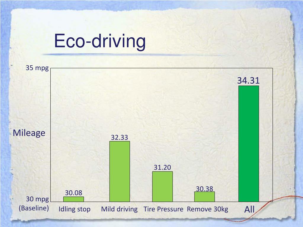 Eco-driving 35 mpg 34.31 Mileage 32.33 31.20 30.38 30.08 30 mpg (Baseline) All Idling stop Mild driving Tire Pressure Remove 30kg