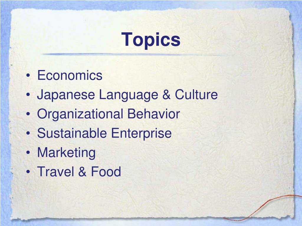 Topics • Economics • Japanese Language & Culture • Organizational Behavior • Sustainable Enterprise • Marketing • Travel & Food