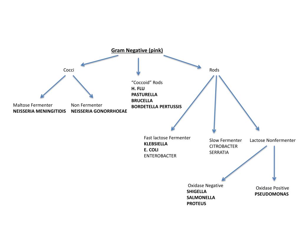 Gram Negative (pink) Cocci Rods “Coccoid” Rods H. FLU PASTURELLA BRUCELLA BORDETELLA PERTUSSIS Maltose Fermenter NEISSERIA MENINGITIDIS Non Fermenter NEISSERIA GONORRHOEAE Fast lactose Fermenter KLEBSIELLA E. COLI ENTEROBACTER Slow Fermenter CITROBACTER SERRATIA Lactose Nonfermenter Oxidase Negative SHIGELLA SALMONELLA PROTEUS Oxidase Positive PSEUDOMONAS